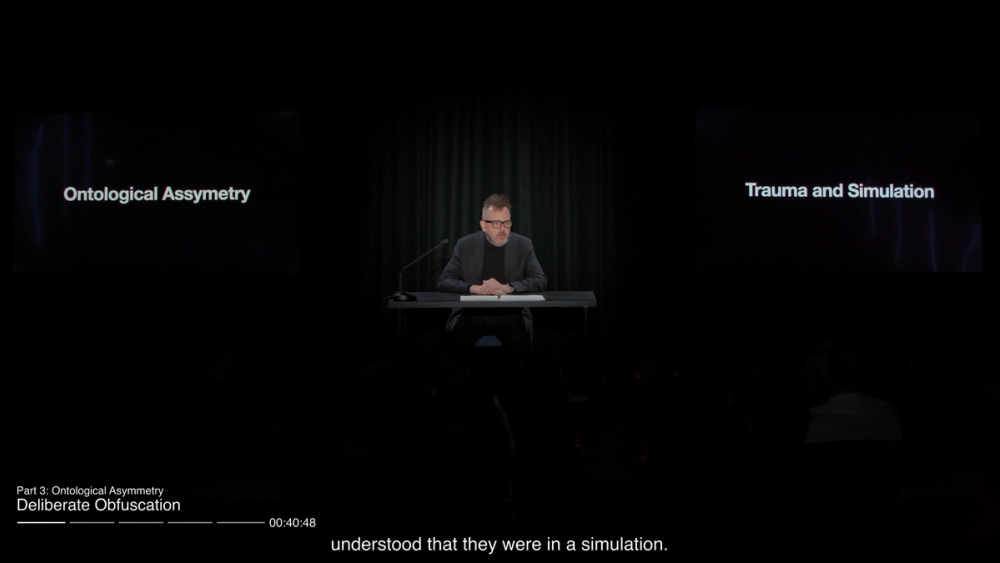 We find ourselves here at the USC School of Cinema, adjacent to the George Lucas and Steven Spielberg buildings. One of the centers of the many-centered simulation industry, where the craft is both theorized and taught. I'll begin with an acknowledgement that the talk you will see tonight understands itself to be training data for some future model about this present moment. In fact, everything you do today was training data for some future model of the past. For the Hawthorne effect we call our shared reality. The present is a simulation of itself as the past. Put differently, moments in time have shadows, as do each of us.